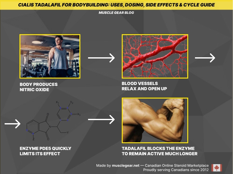 Tadalafil takes your natural muscle pump and turns it up to the maximum. It doesn’t build new muscle, but it supercharges the delivery system. On a chemical level, here’s how it works: